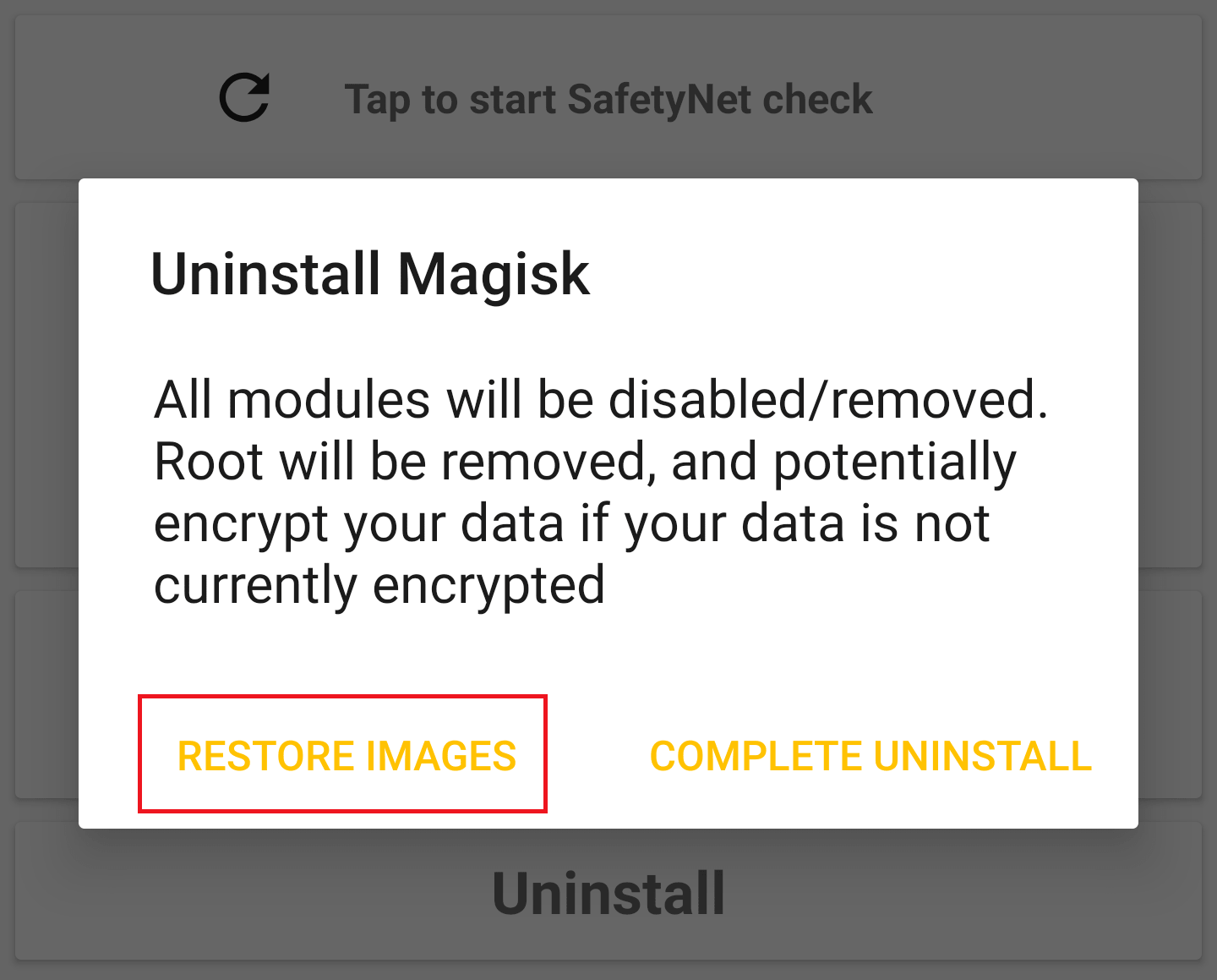 - When an OTA is available, first go to (Magisk app → Uninstall → Restore Images). Do not reboot or you will have Magisk uninstalled. This will restore partitions modified by Magisk back to stock from backups made at install in order to pass pre-OTA block verifications. This step is required before doing any of the following steps written below!